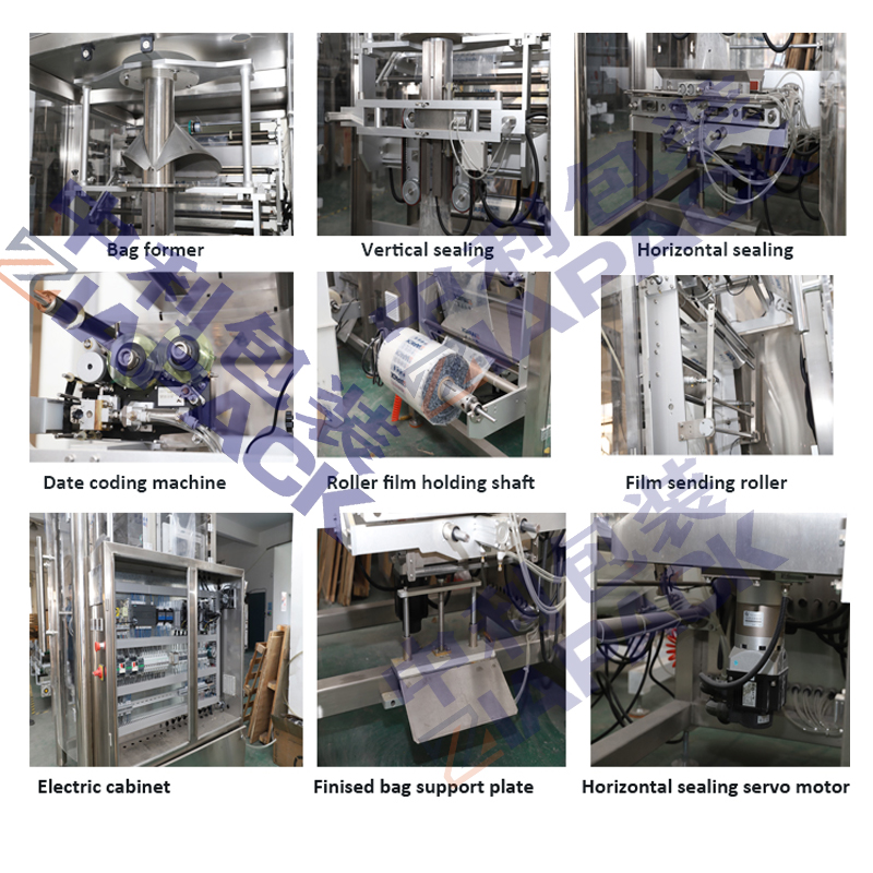 Ця машина може автоматично реалізовувати функції виготовлення мішків, наповнення, запечатування, друку, різання тощо. Ця машина може автоматично досягати наповнення та запечатування мішків.