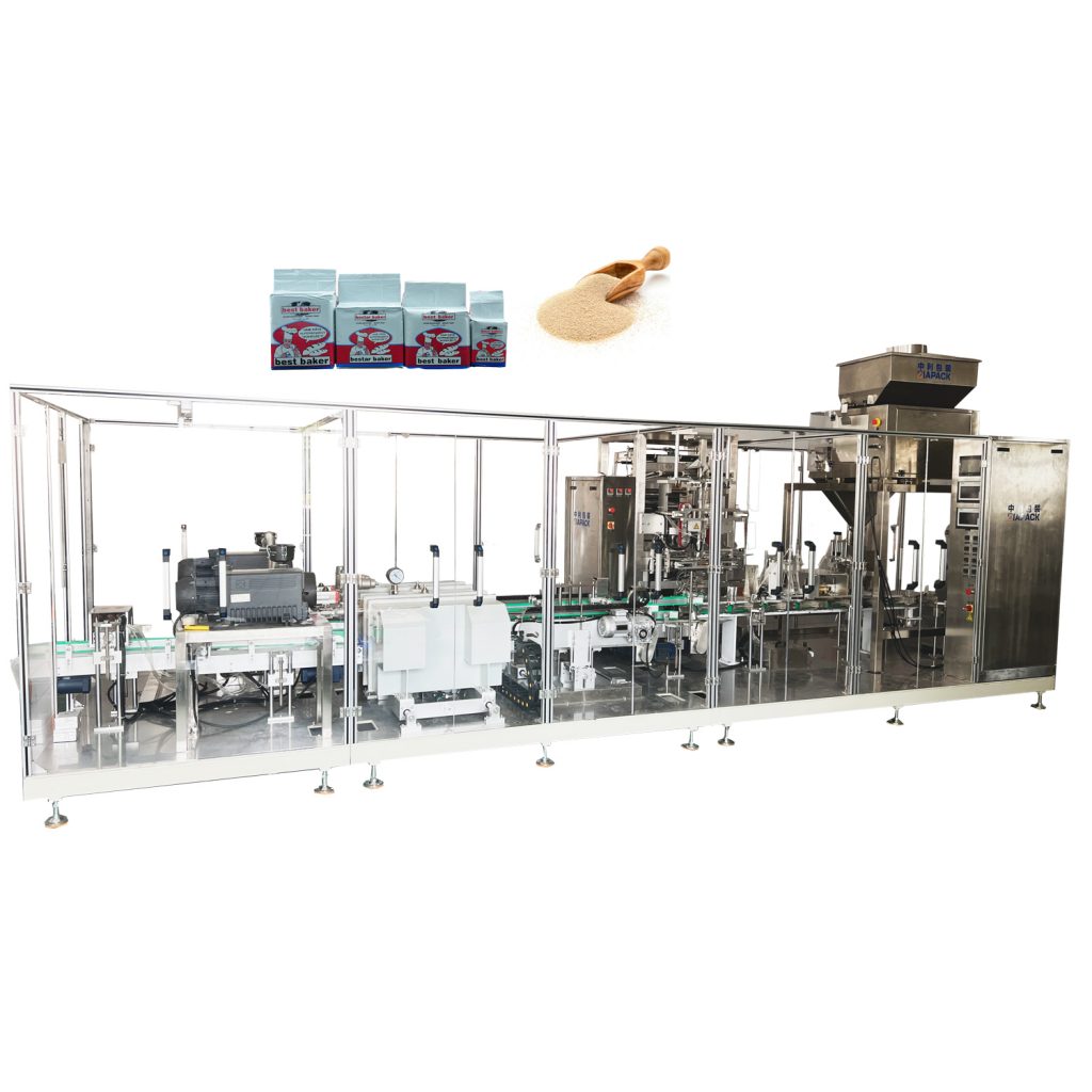 Ця машина включає в себе один набір вакуумного елеватора ZK3 для подачі сухих дріжджів, один набір ZL520 для вертикальної упаковки та запечатування пакетів. Один набір ZLC4-2000 чотиривідерної ваги, один набір ZL-100V2 з подвійною вакуумною камерою. Ця машина широко використовується для упаковки харчових аптечних хімікатів та інших продуктів у порошок або дрібну гранулу. Як кавовий порошок, дріжджовий порошок, пшеничне борошно тощо. Вся машина приймає всередині насос для вакуумування продукту. Ступінь вакууму дуже високий, а швидкість пакування дуже висока, може досягати 30 пакетів/хв. Готовий продукт має тривалий термін зберігання та гарну форму.